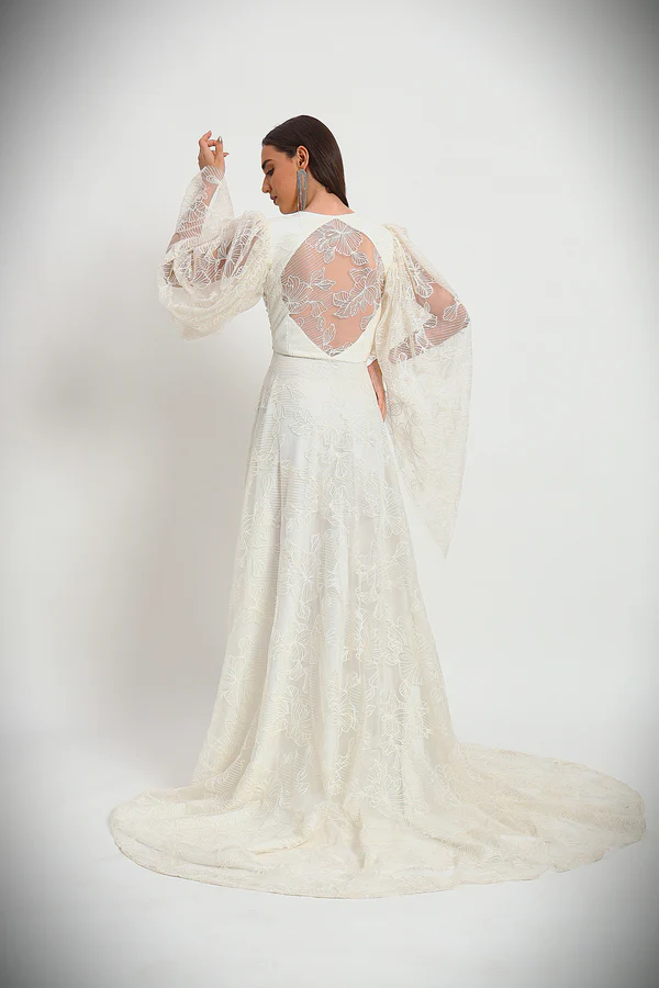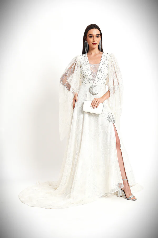 Inspired by the ethereal glow of the moon, the Lunar Glow Gown radiates elegance and sophistication. Crafted with delicate lace and adorned with sparkling celestial embellishments, this gown creates a breathtaking vision in white. The cape-like sleeves add a touch of whimsy, while the structured bodice ensures a flattering fit. Perfect for evening galas or glamorous events, this gown encapsulates the magic of the night sky with a modern edge.